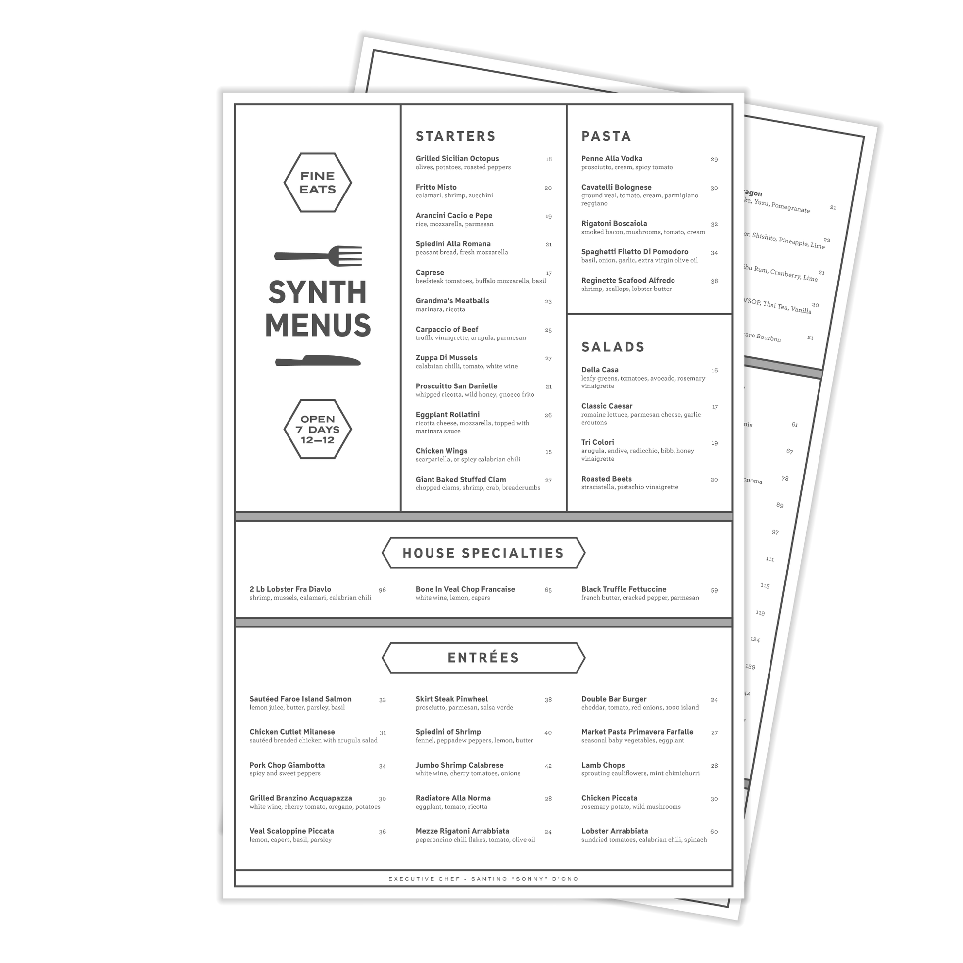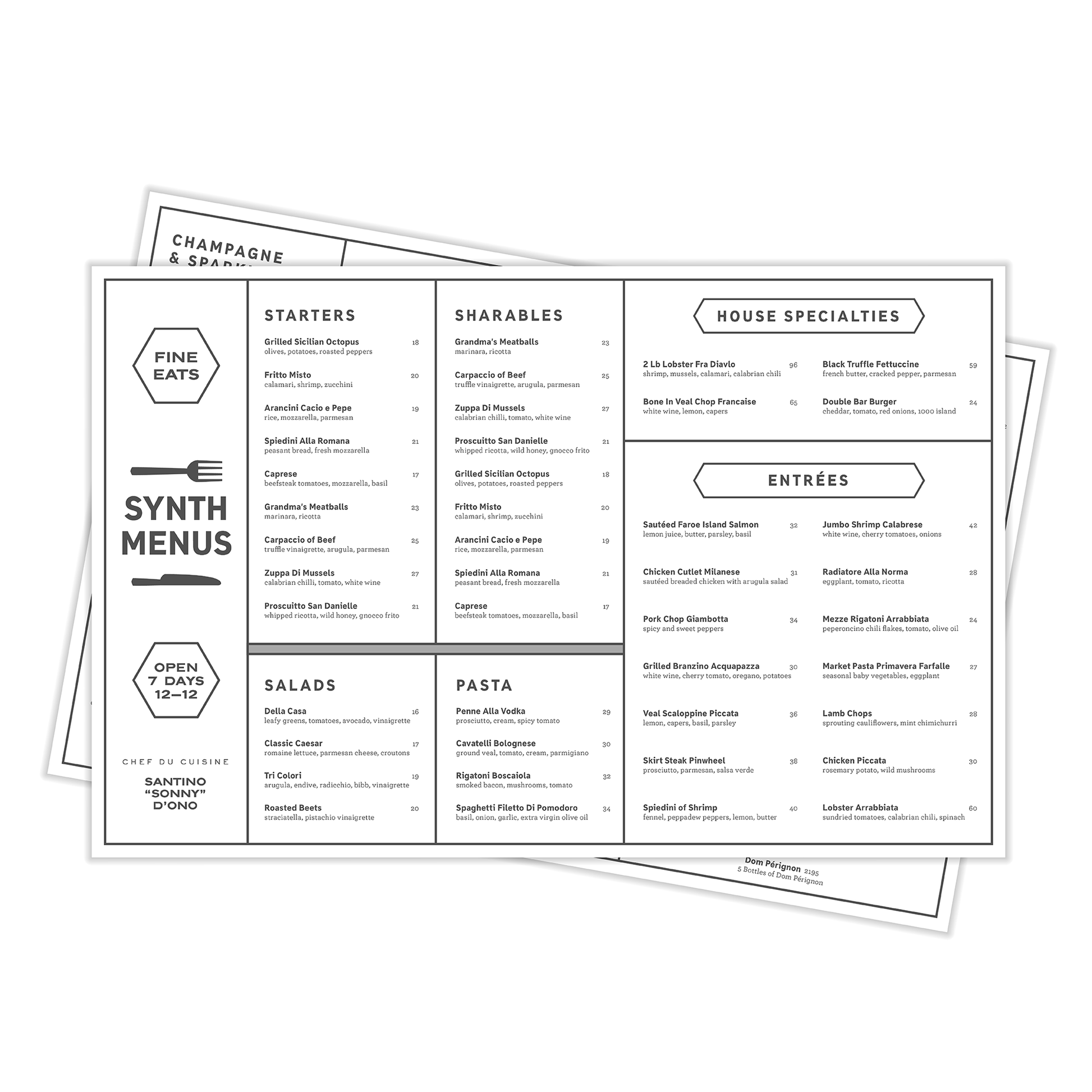 High quality, water-resistant menus printed on our synthetic, water-resistant menu stock.