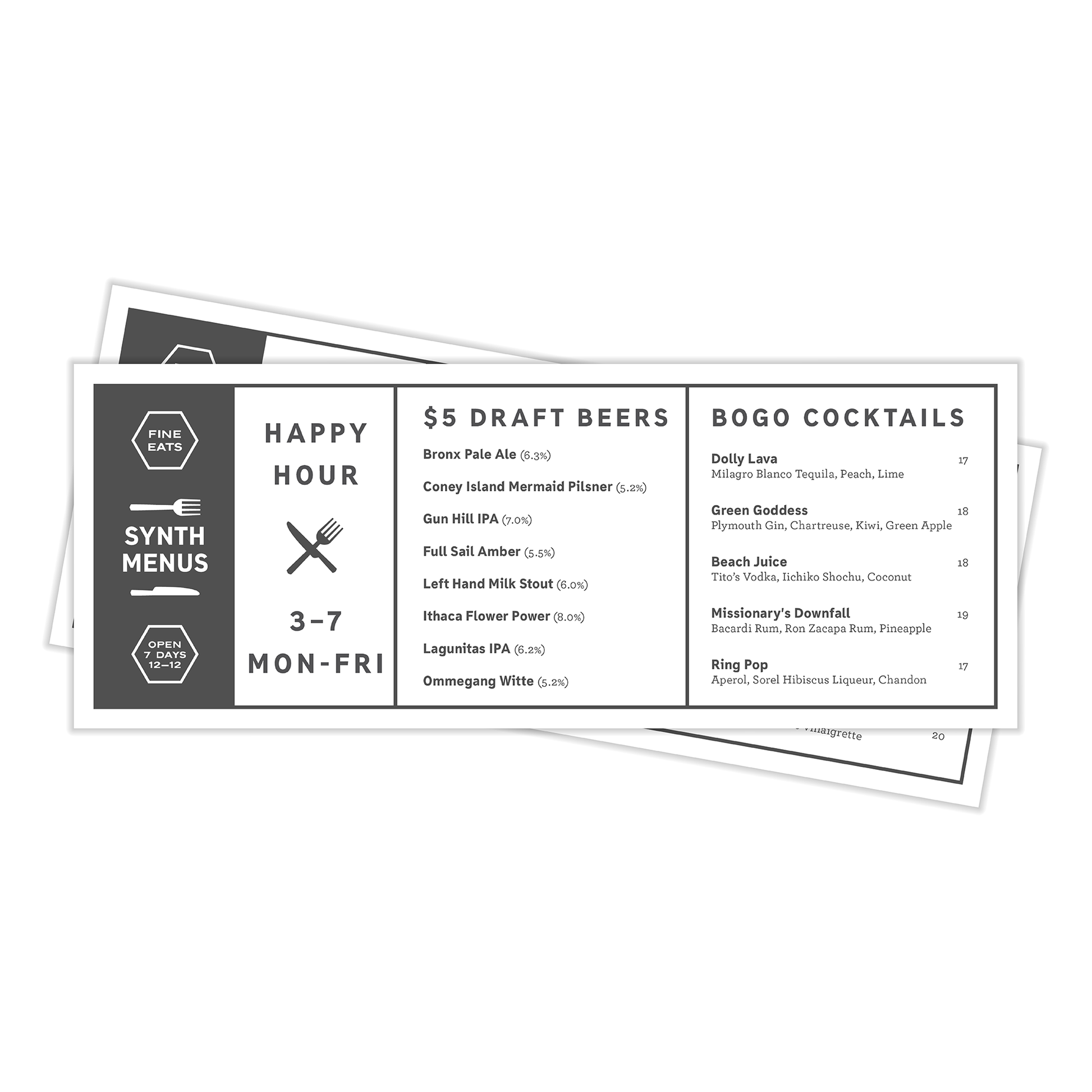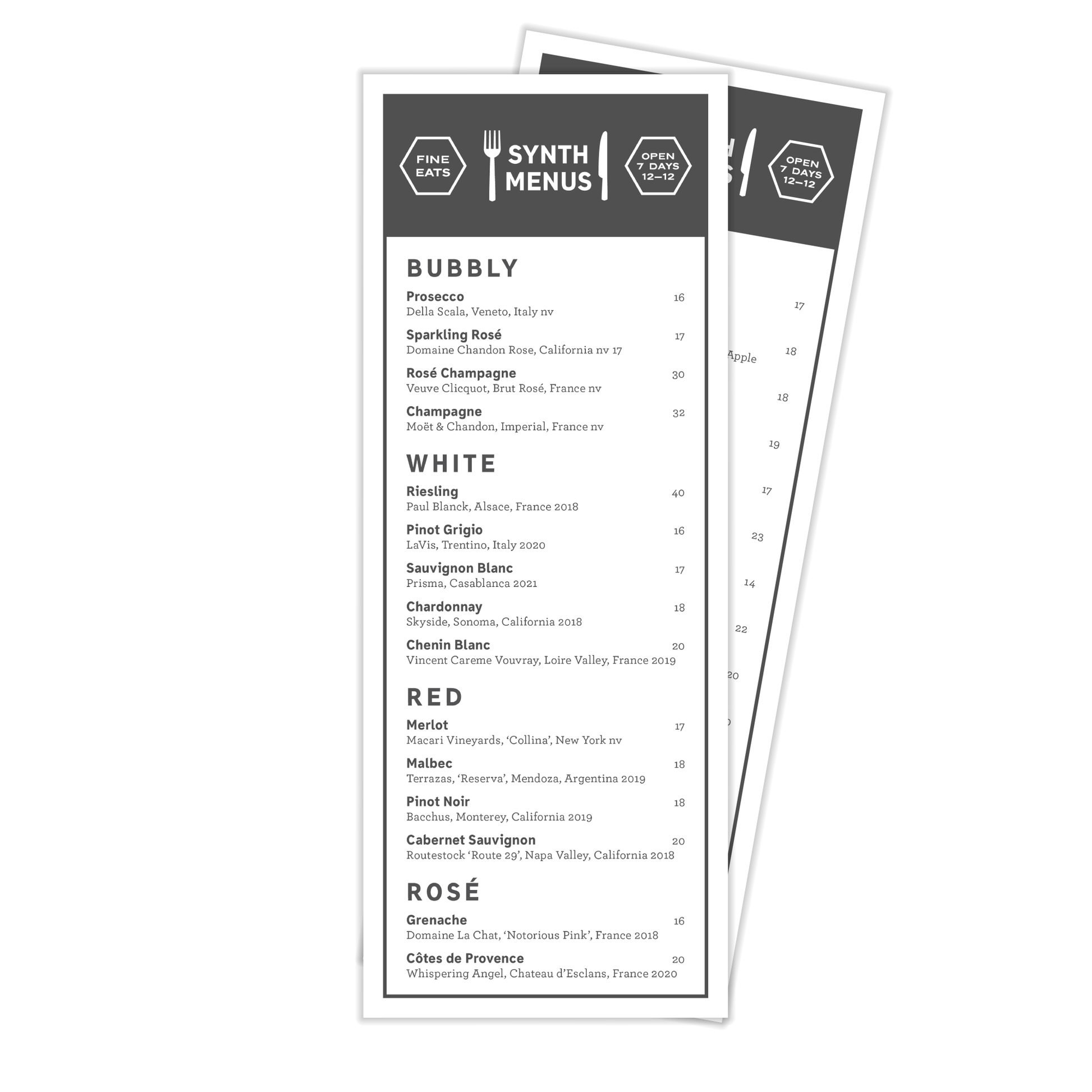 High quality, water-resistant menus printed on our synthetic, water-resistant menu stock.